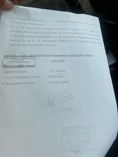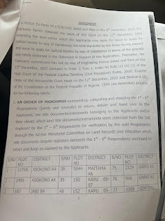 Defendants in suit are the FCT Minister,  Federal Capital Development Authority, The Deed Registrar FCDA, Director Department of Urban and Regional Planning, Chairman Abuja Metropolitan Management Council and the Director of Land Administration FCT.